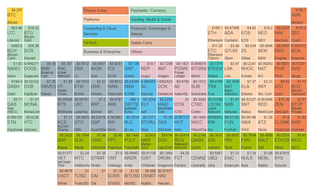 Crypto Table 把数字货币分为以下几个类型,并用不同的颜色代表不同的数字货币类型: