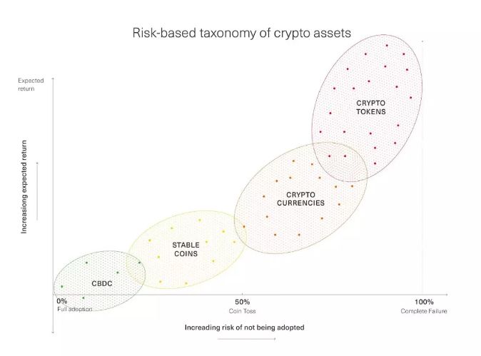 最左下角的集合代表了中央银行发行的数字货币,比如,委内瑞拉发行的石油币、厄瓜多尔发行的厄瓜多尔币。位于该集合内的数字资产不被接纳的风险非常之小,但与之相对应的是,投资这种数字资产的预期收益也是最小的。