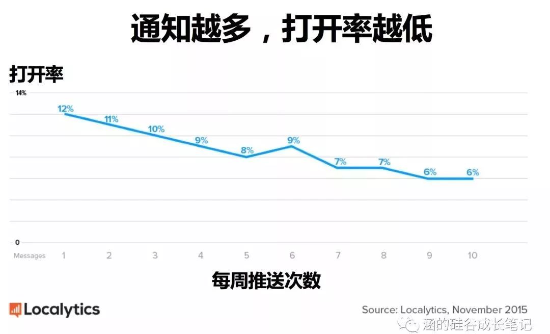通知打开率随着每周发布通知次数的增加而降低。当每周只发一条通知时,打开率高达 12%,而发布 10 条时,会跌一半。