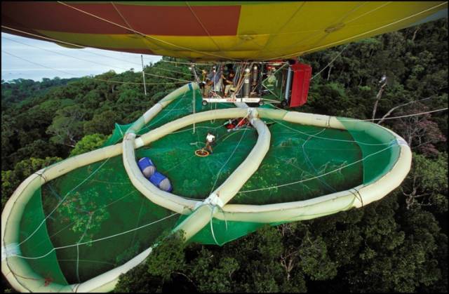 有的时候科学家会用充气的管子做为骨架,套上一张巨大的网做成“气垫船”,然后用热气球把船带到树冠上去,研究者们就可以悠闲地坐在“林冠气垫船”里做实验了。