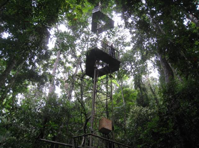 这也是一个一劳永逸的方法,在森林中修一个铁塔,一直达到林冠。这种方法现在主要用来研究森林的微气候、森林与大气的气体交换等,铁塔上通常会装上好多测量仪器,实时监测记录数据。