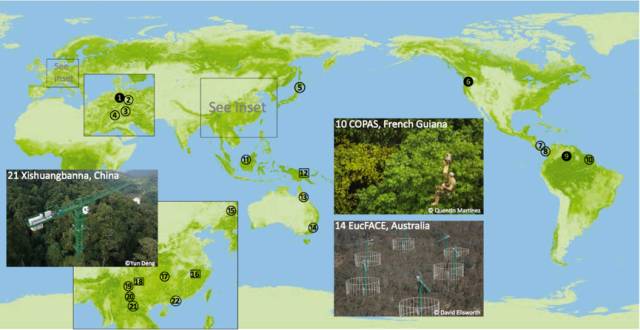 世界范围内的林冠塔吊分布图。图片:Nakamura A / Trends in Ecology & Evolution(2017)