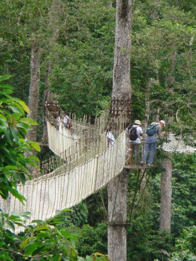 上图是在西双版纳热带雨林里修建的空中走廊,通过连接不同的望天树,在树顶形成了一条500米长的小路,让科学家可以方便地到达林冠进行研究。