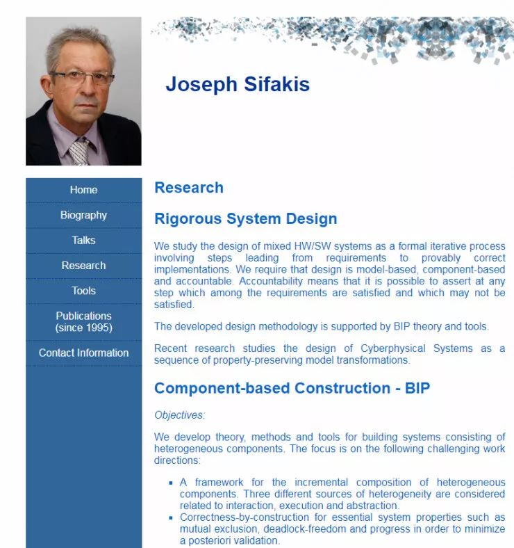 另外,在 Joseph Sifakis 的个人主页,也介绍了其当前主攻严密系统设计(Rigorous System Design),Component-based Construction - BIP 和图灵奖成果—模型检测(Model Checking)这三个研究领域。
