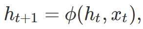循环模型的众多变体都具有类似的形式。该模型凭借状态 h_t 梳理过去的输入序列。在每个时间步 t,根据以下等式更新状态: