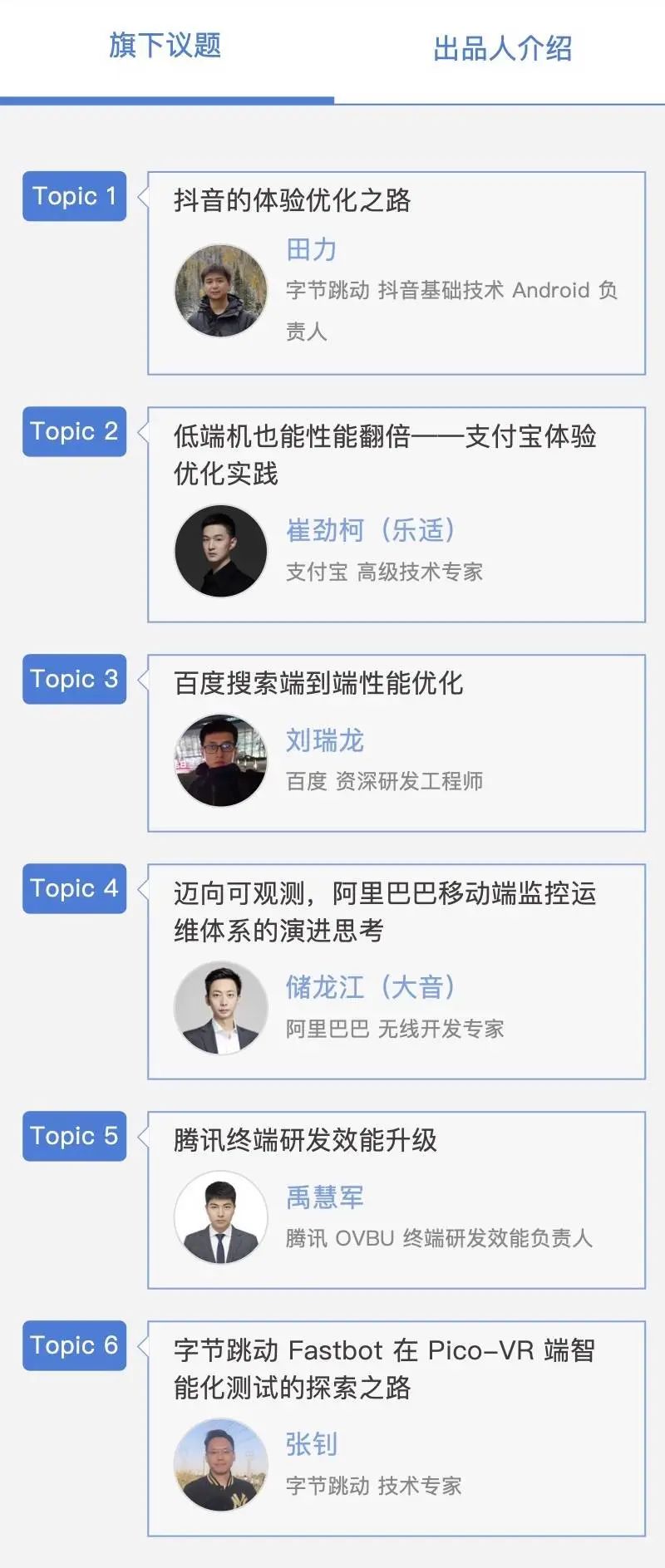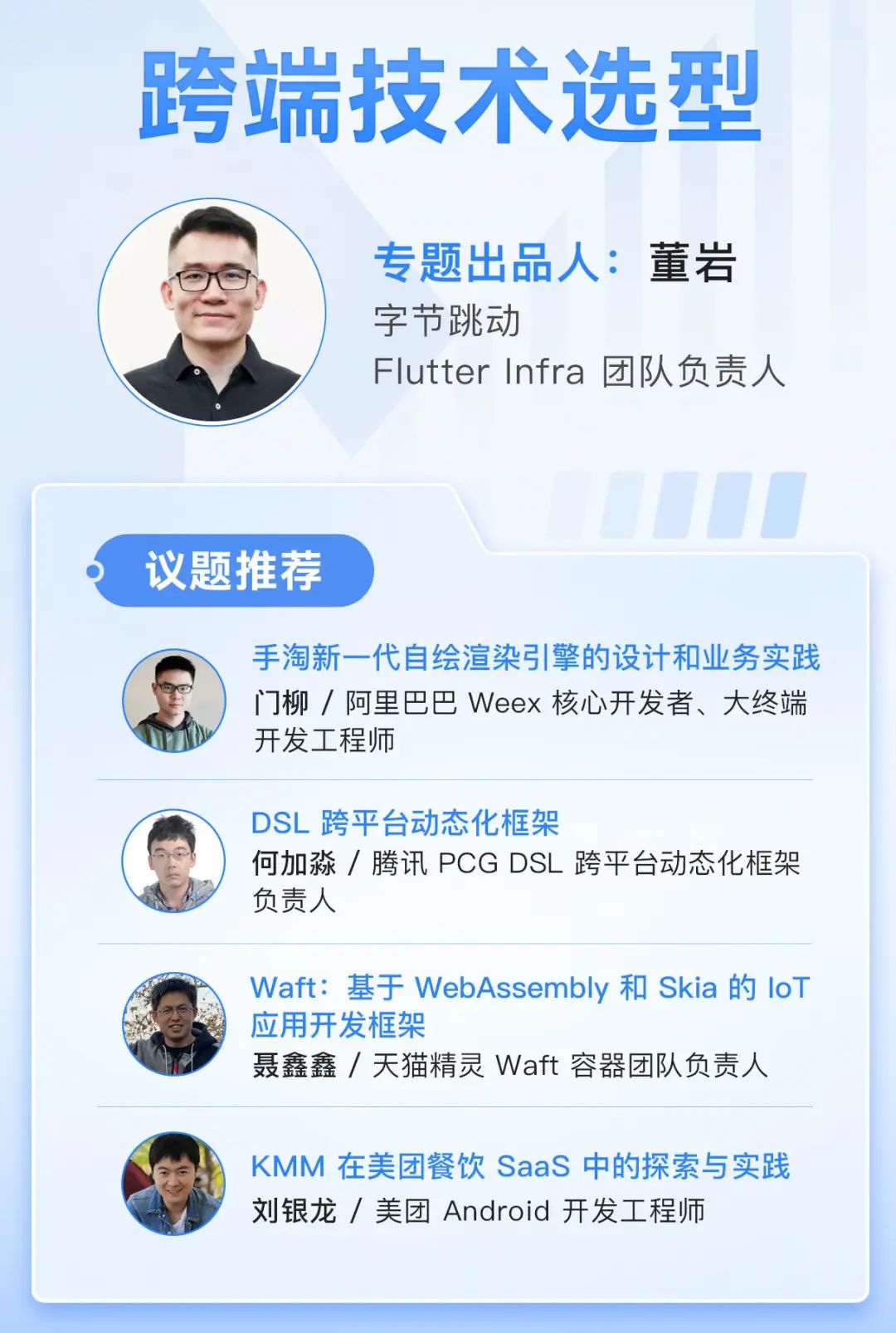 除此以外,跨端技术选型、移动端性能与效率优化、前端 DevOps 实践、云研发实践等专题的议题邀请进度已经过半,对应演讲信息如下: