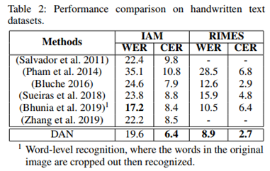 通过改变FE和CAM中卷积操作的步长,DAN可以在一维和二维形式之间灵活切换,以应对不同的应用场景。FE输出特征图高度被压为1,即一维识别形式时,DAN适用于规则的手写长文本识别;在进行二维形式时,DAN适用于不规则的场景文本识别。在不同应用场景中,DAN灵活而高效,均取得了SOTA或相当的效果。