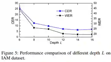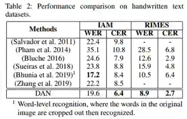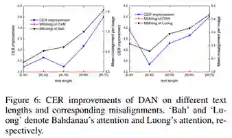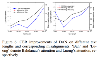 (3)对消除对齐错误的深入分析。本文选择了两种经典的attention结构:Bahdanau’s attention和Luong’s attention,在IAM数据集上进行了进一步对齐效果分析。从Figure 6可以看出,DAN有效缓解了长文本上的对齐问题。