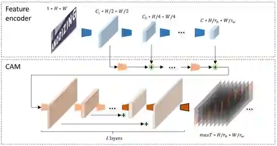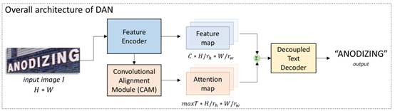 DAN由三个模块组成:特征提取器(FE)、卷积对齐模块(CAM)、去耦解码器(DTD)。FE对输入图片提取多个尺度的特征图;CAM接收特征提取器中的多尺度特征,采用全卷积结构,输出与特征图等尺寸的attention map;最后DTD解码出识别结果。