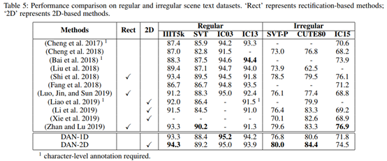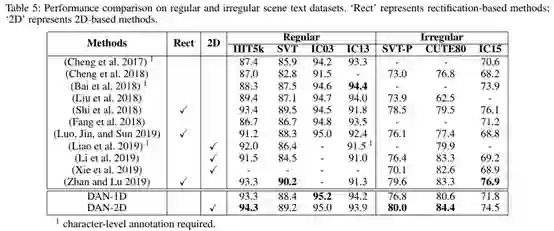 结果对比如Table 5所示。可以看出,DAN在大部分数据集上取得了SOTA或相当的效果,同时,二维识别在不规则文本数据集上的识别效果明显好于一维识别。