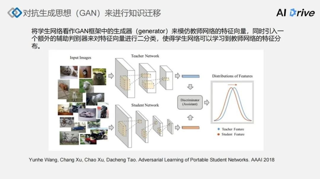 另一个思想用对抗生成(GAN)。可以将学生网络看成 GAN 框架中的生成器,来模仿教师网络的特征向量,同时需要引入一个额外的判别器,来对特征向量进行二分类,然后通过对抗生成的框架,可以使得学生网络学习到教师网络的概率分布——这就是特征分布。