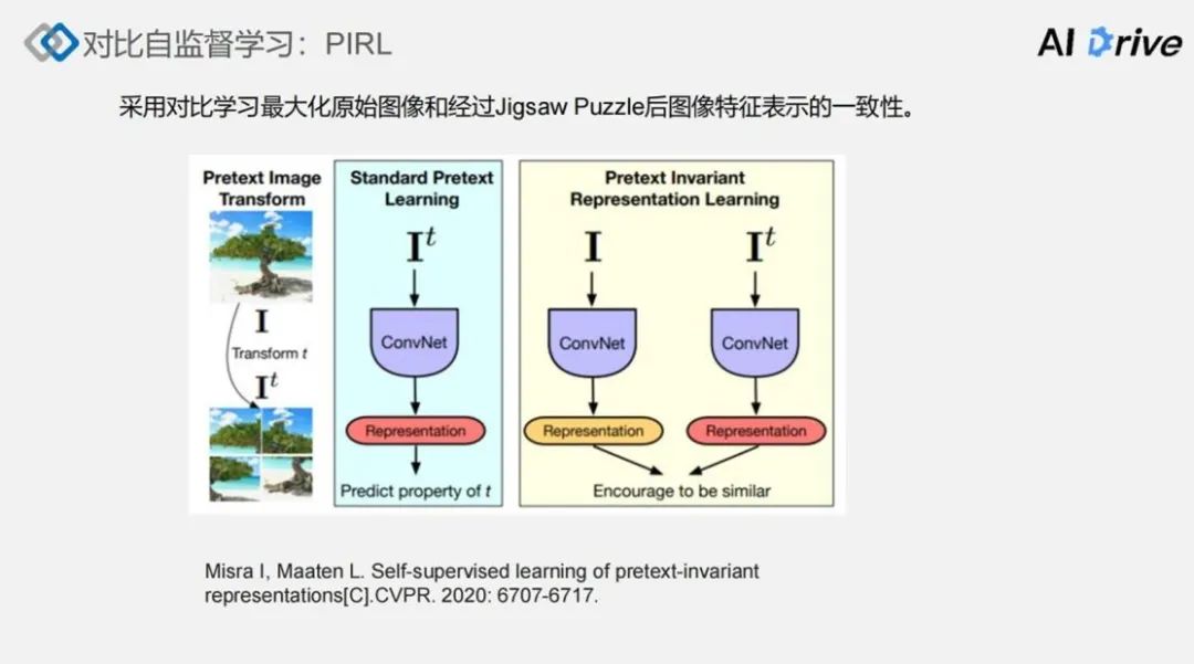 另一个比较有代表性的对比自监督学习工作是 PIRL,其对比学习的框架跟 SimCLR 是一致的,它的主要思想也是对一张图像施加转换,将一个图像的不同转换的视角作为正样本,其他图像作为负样本,文中引入了一个 Jigsaw Puzzle 转换。