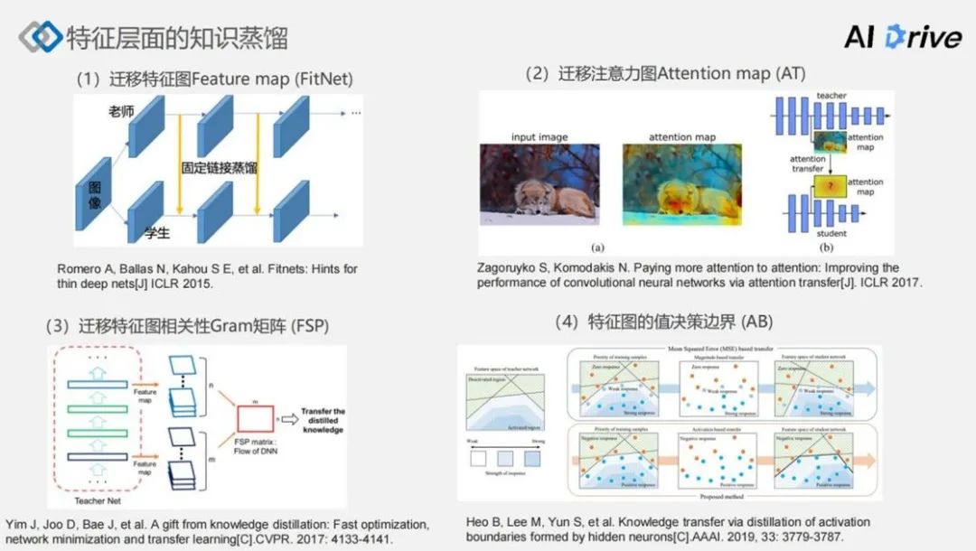 通常可以概括为三个层面:第一个层面是决策概率分布,response-based;第二个是特征信息,feature-based;第三个是高阶的跨样本相似度关系,relation-based。