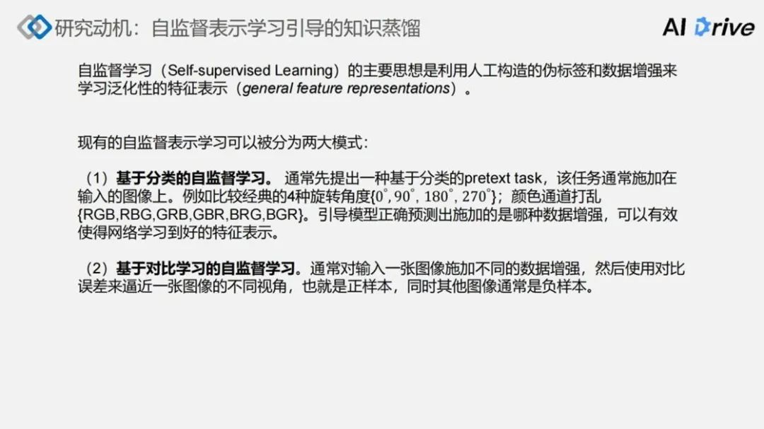 随着自监督表示学习的发展,不同模式的算法被提出,本质上还是能够使得模型学习到泛化能力更好特征表示。直觉上讲,算法越好,其对应的知识表达形式在知识蒸馏领域就越可以 work。