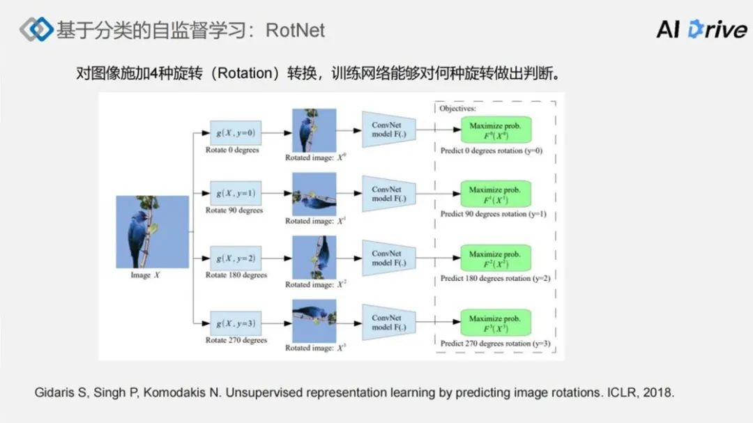 例如上图由于是 4 种旋转角度,相当于是一个自监督的自分类问题。对一个图像旋转 90 度,然后要求卷积神经网络能在 4 种角度中,正确判断出旋转的是 90 度,最后分类的 loss 也是基于传统的交叉分类 loss。