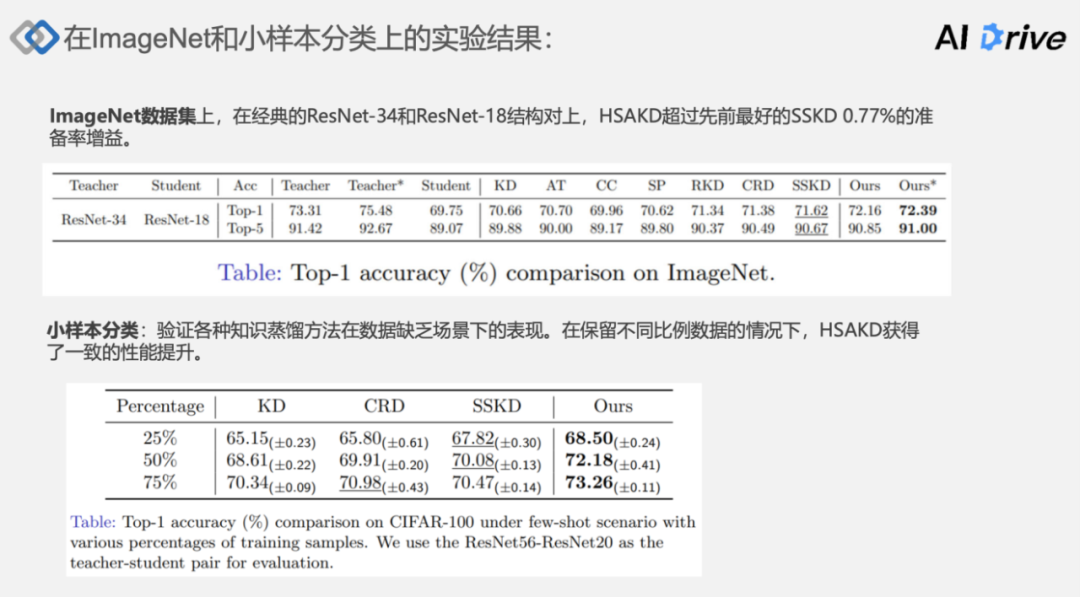 (1)在ImageNet 数据上,在经典的 ResNet-34 和 ResNet-18 结构对上,HSAKD 超过先前最好的 SSKD 0.77% 的准确率增益。