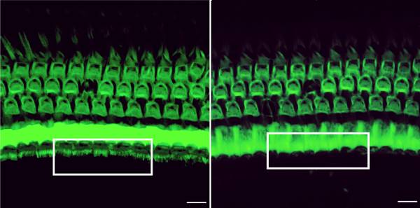 Treatment with a genome editing agent can preserve sound-detecting bristles in the inner ear of mice with genetic deafness (white box, left). Without the treatment, these bristles disappear (white box, right). Credit: Gao et al. /Nature 2017