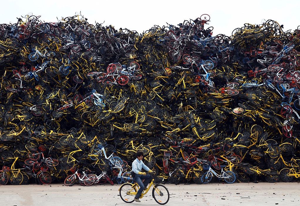 2017年12月13日,厦门,一空地堆积如山的共享单车,工人骑车经过。这一年,共享单车风潮席卷全国,被誉为中国新四大发明之一。