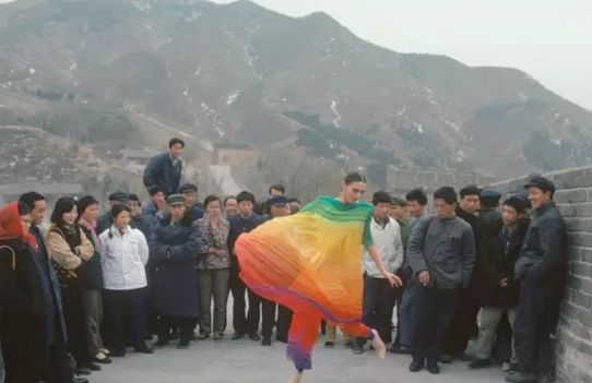 1979年,在长城上,一位身着艳丽服饰、翩翩起舞的女性吸引了游客们的目光。改革开放初期,大家还穿着千篇一律的灰色中山装或蓝色解放装。