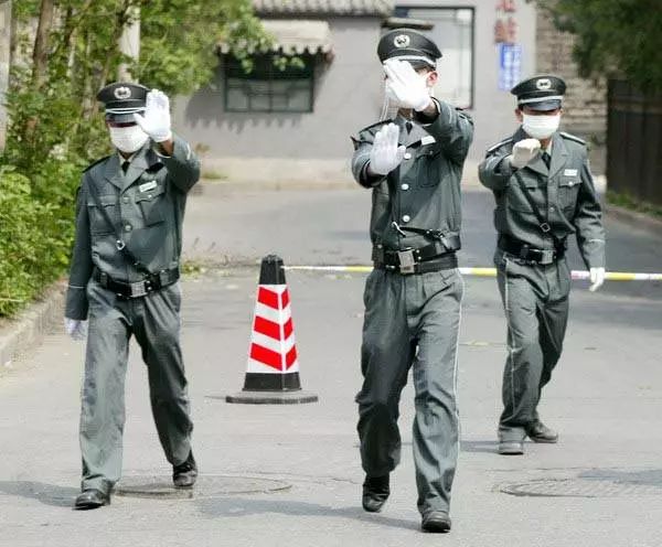2003年,非典疫情爆发,图为三名护卫员戴着口罩封锁北京地坛医院。当时,白醋和板蓝根被人们普遍认为可以预防非典,在国内许多城市出现了大面积的抢购风潮,板蓝根一时脱销,一瓶白醋甚至被卖到200元。