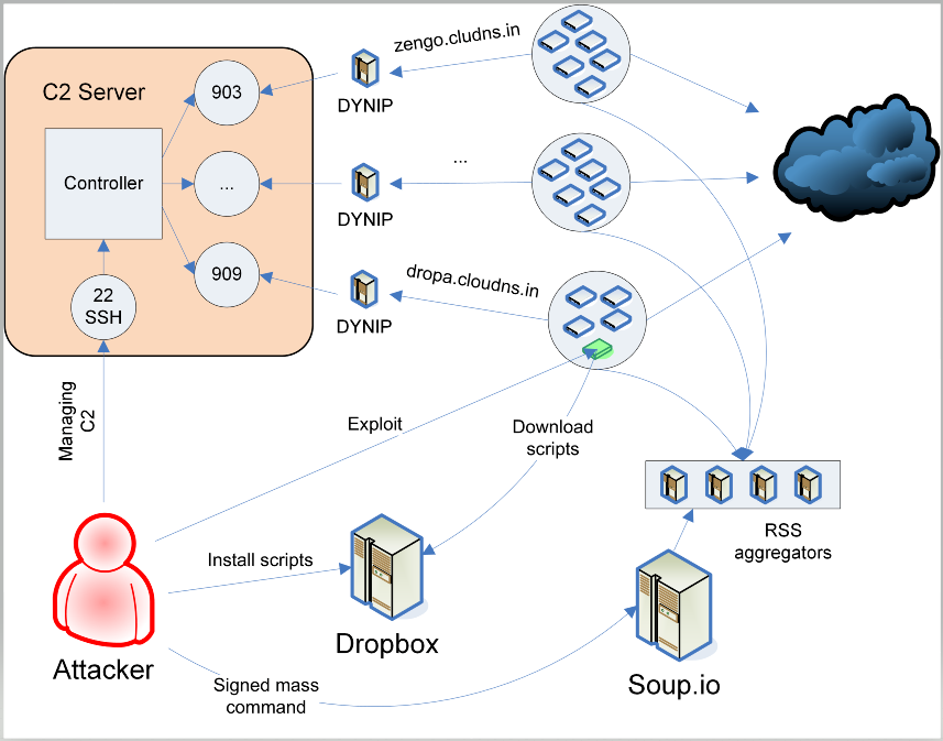别看只利用到了一项漏洞,但 Cereals 僵尸网络本身还是相当先进的。Cereals 中包含多达四种后门机制以持续访问受感染设备,不断更新后门以防止受感染设备被其他攻击者所劫持,并通过 12 个较小规模的子网对受感染的肉鸡设备进行管理。