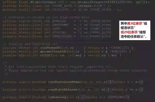 变量ctl定义为AtomicInteger,记录了“线程池中的任务数量”和“线程池的状态”两个信息。