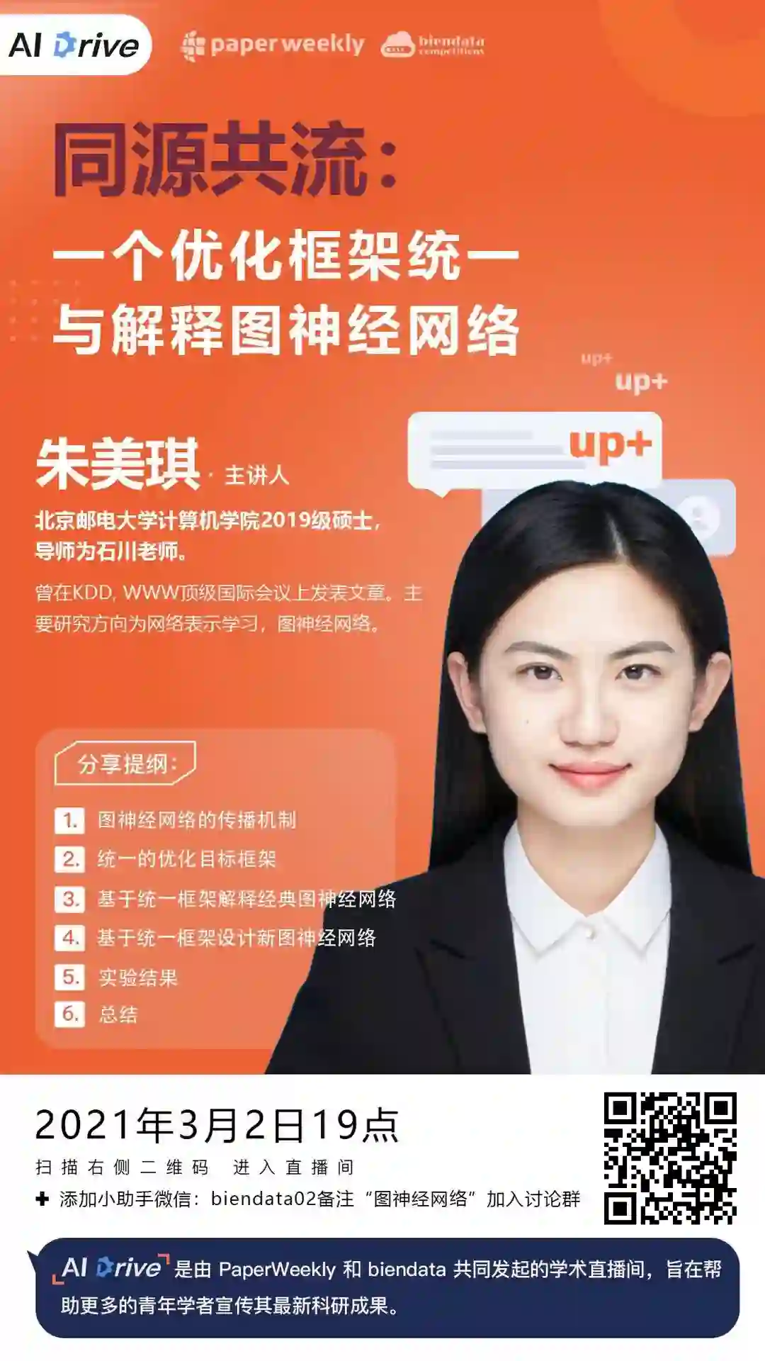 本期 AI Drive,我们邀请到北京邮电大学计算机学院硕士生朱美琪,为大家带来同源共流:一个优化框架统一与解释图神经网络的专题直播。对本期主题感兴趣的小伙伴,3 月 2 日(周二)晚 7 点,我们准时相约 PaperWeekly B 站直播间。