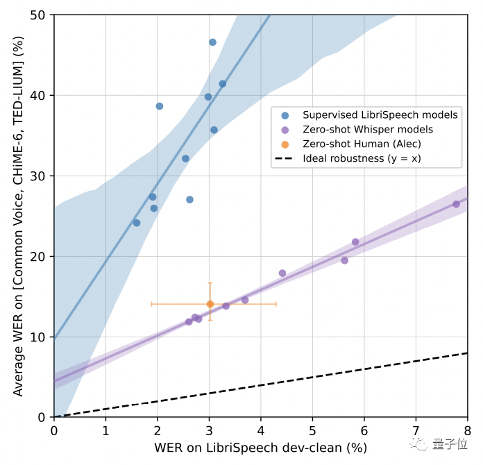 可以看出,与人类Alec相比,LibriSpeech模型的错误率大约是人类的两倍,而Whisper模型的鲁棒性边界则包括Alec95%的置信区间。