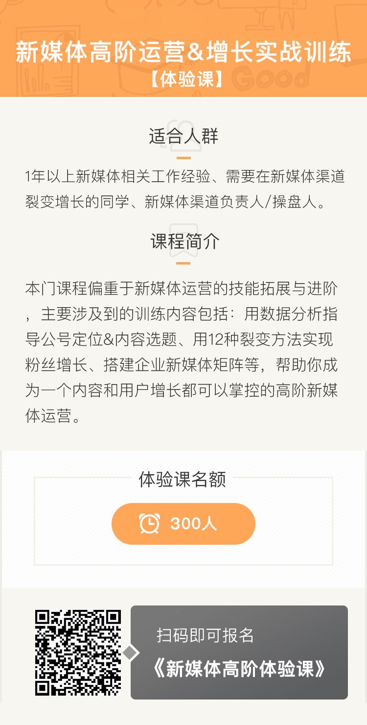 因此,我们才找到了业内我们最认可的新媒体操盘手之一火火老师,联手打造了《新媒体高阶运营&增长实战训练》课程,为了帮助大家深入了解,且能获得真正的成长,我们针对本次课程开展了一期体验课,仅需支付19元即可体验,且完成打卡任务全额退款!仅限300个名额!想要抢座的同学,赶快扫描下方海报中的二维码报名吧!
