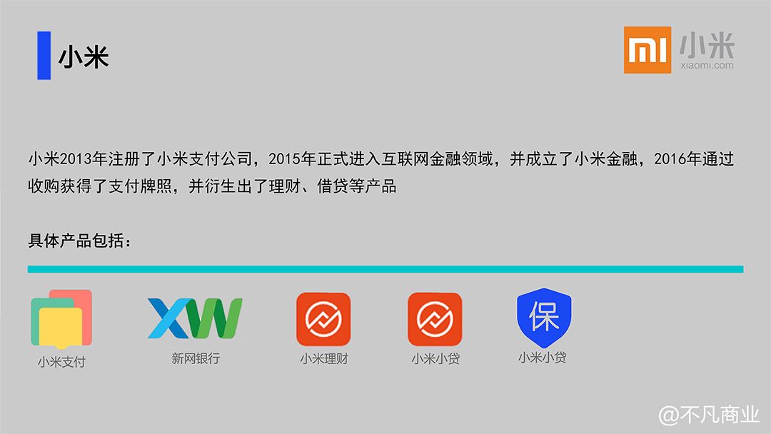 新网银行:小米参与投资创立的互联网银行,对标网商银行和微众银行;