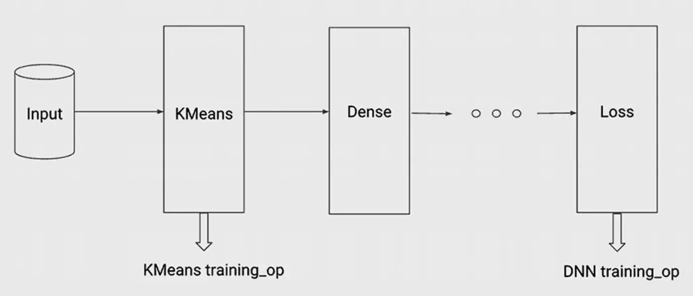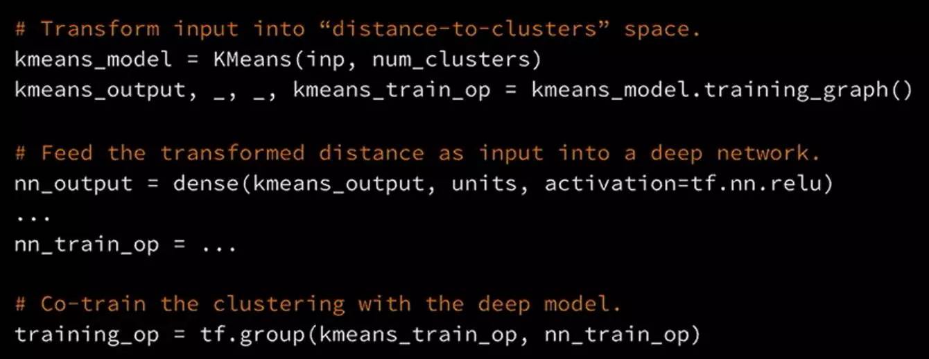 这里有一个训练—一个例子将k-均值嵌入到更深的网络中。你从输入开始,运行k-均值得到用于k-均值的图形,它会返回training_op来驱动聚类。输出是将输入转换为聚类空间的距离。下一步,把这个放到密集的堆栈层创建监督损失,运行STD得到最后的DNN training_op。现在有这两个training_op,可以把他们加入到一起创建一个单一的training_op,驱动这两个模型的核心训练。
