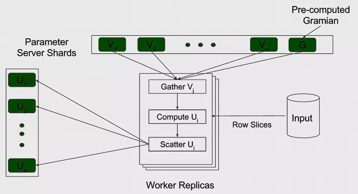 让我们再来看下WALS,运用WALS将非常稀疏的矩阵因式分解成致密的因素。如果希望能够有百万兆字节规模大小的输入,有上百万行上百列的元素,那么如何做呢?