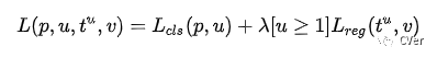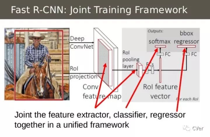 Fast R-CNN的第二点创意是把之前独立的三个步骤(特征提取、分类和回归)放到一个统一的网络结构中。该网络结构同时预测一个候选区域的物体类别和该物体的边界框,使用两个全连接的输出层分别进行类别预测和边框预测(如下图所示),将这两个任务进行同时训练,利用一个联合代价函数: