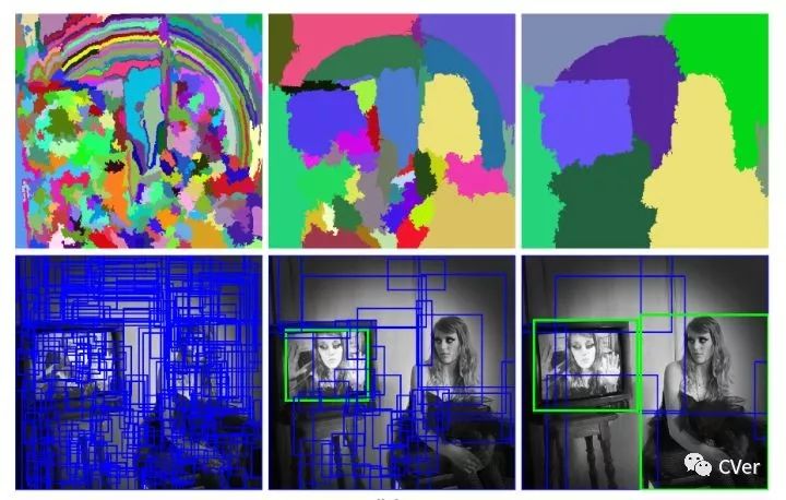 在R-CNN出现之前,目标检测的流行思路是先从图像中得到一些候选区域,再从候选区域中提取一些特征,然后利用一个分类器对这些特征进行分类。分类的结果和候选区域的边界框就可以作为目标检测的输出。一种得到候选区域的方法是Selective Search, 该方法可以得到不同尺度的候选区域,每个候选区域是一个联通的区域。如下图中,左边得到的是较小的候选区域,右边是较大的候选区域,在该尺度下包含了整个人的区域。