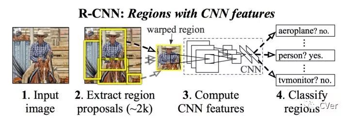 R-CNN的思路是很直观的三步曲:1,得到若干候选区域;2, 对每个候选区域分别用CNN分类;3,对每个候选区域分别进行边框预测。