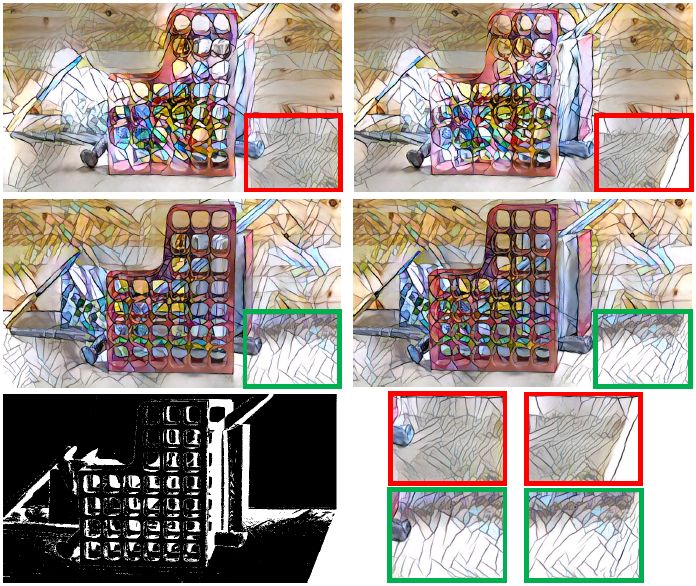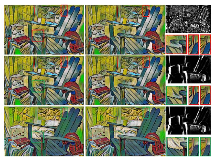 图 6. 与使用 [10] 中所用方法(第一行)的一个类似变体的结果对比,该变体方法存在重影和风格化不一致的问题。中间行是使用了本文的方法构成掩码替换的结果,重影消失了,但是不一致性仍然存在。相比之下,本文的结果(最底行)没有上述问题。