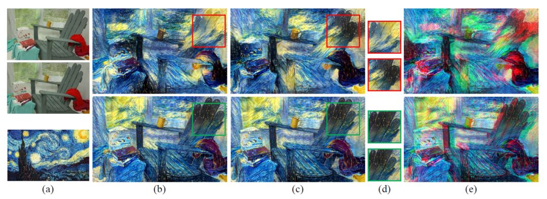 图 1. 图(a)给出立体图像对和一副风格图像,立体图像的左右视图都被进行了风格化(第一行),左视图的风格化结果(b)和右视图的风格化结果(c)会在空间对应区域(d)不一致。这会导致不期望的垂直差异和不正确的水平差异,进而在立体图像(e)中造成 3D 疲劳。相对而言,通过引入新的视差一致性约束,本文的方法(第二行)可以为两个视图生成一致的风格化结果。