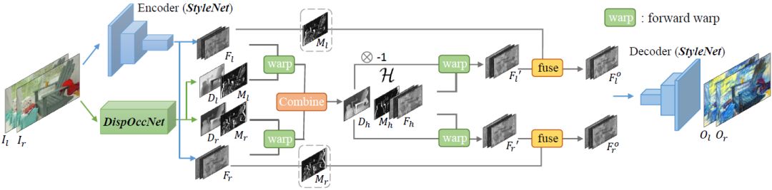 图 3. 快速立体风格迁移的总体网络结构。它包含两个子网络:StyleNet 和 DispOccNet,它们被集成在特征级别中间域 H 中。