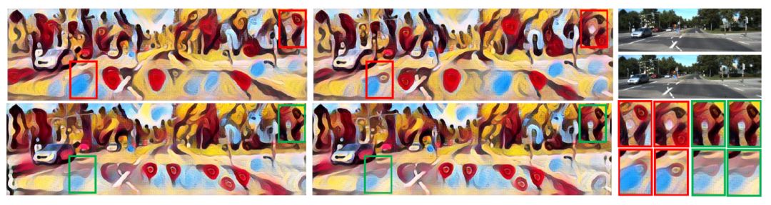 图 7. 与真实街道视图立体图像对的基准进行比较。第一行中带有红色标记框是基准结果,底行含有对应的绿色框的是本文的结果。显然,本文的结果具有更好的视差一致性。