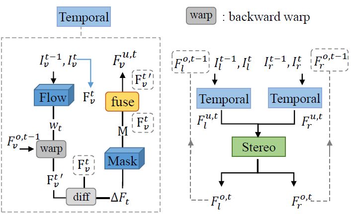 图 4. 立体视频风格迁移的总体结构。左边是时间网络的简化工作流。右边是用于结合上述立体网络和左边附加的时间网络的递归公式。