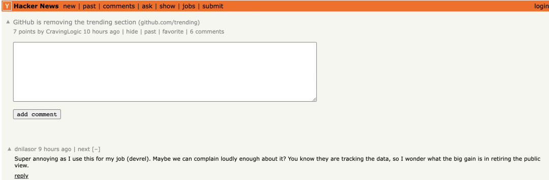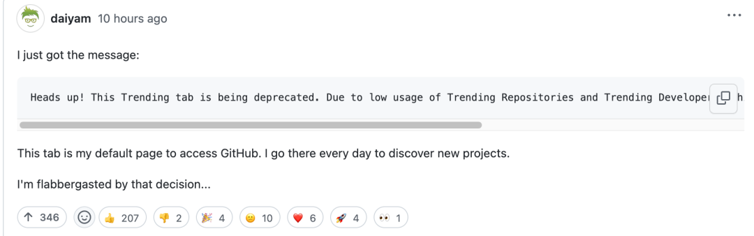 一位开发者在讨论区留言称,“这个功能是我访问 GitHub 的默认页面。我每天都会去那里发现新的项目。我对这个决定感到吃惊...”。
