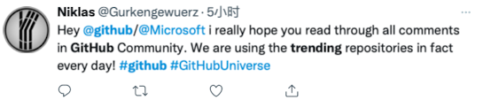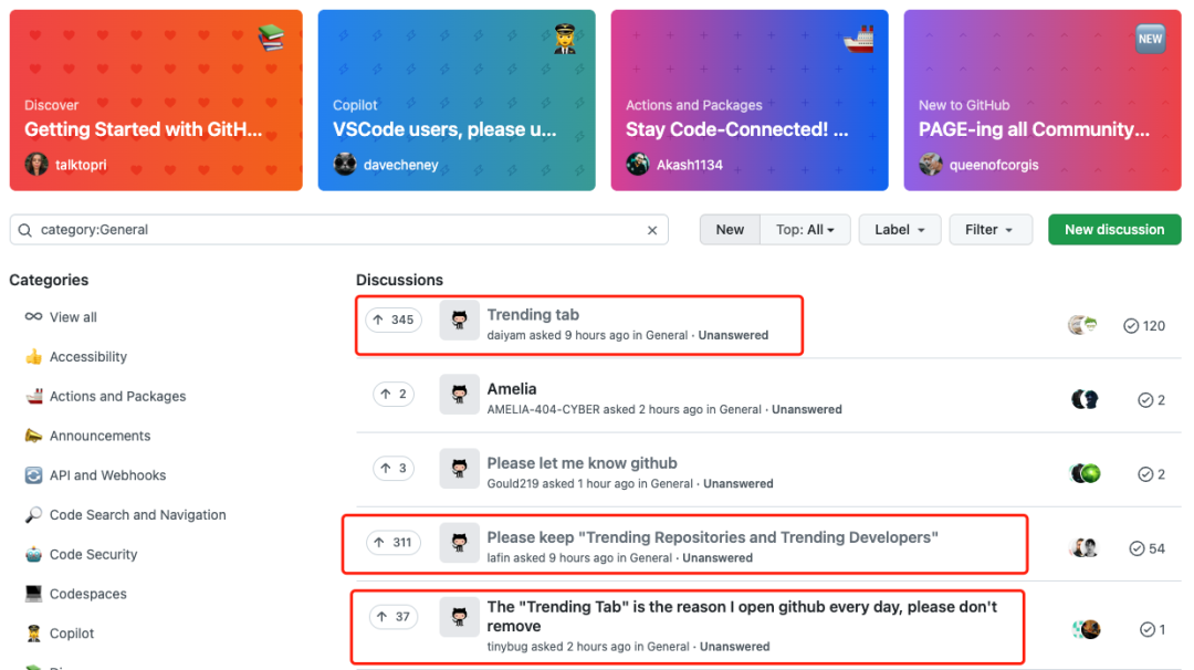 此举也让通过 Trending 热榜查看每天、每周、每月比较活跃且有趣的项目库、了解一线开发者的使用者们感到不满,其纷纷涌进 GitHub 社区讨论板块,前五条中便有三条是关于 GitHub Trending 的讨论。