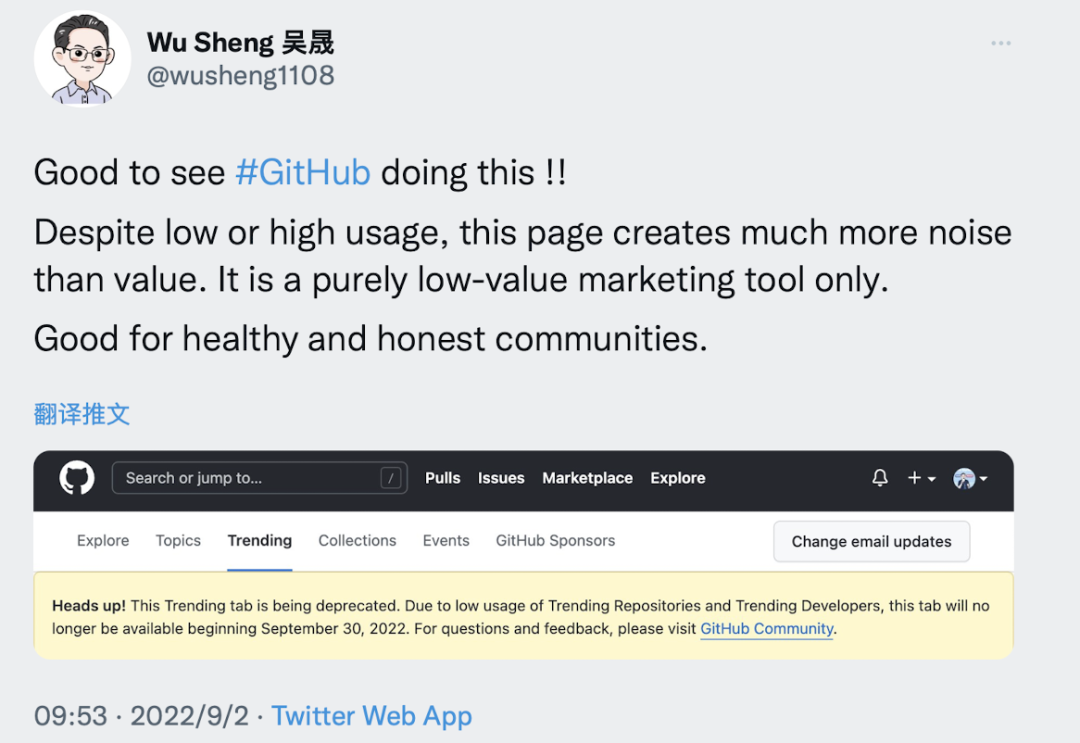 Apache SkyWalking 创始人吴晟转发并支持这一点观点,他评价道,「很高兴看到 GitHub 这样做!无论(GitHub Trending)使用率低或高,此页面产生的噪音远大于价值。它只是一个纯粹的低价值营销工具。此举有益于健康和诚实的社区。」