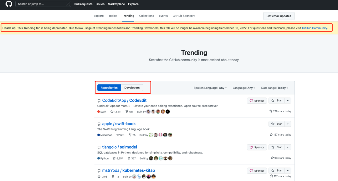 注意了! 这个 "Trending "标签已被废弃。由于 Trending 页面上"Repositories"和 "Developers "的使用率较低,从 2022 年 9 月 30 日起,该标签将不再可用。如有问题和反馈,请访问 GitHub 社区。