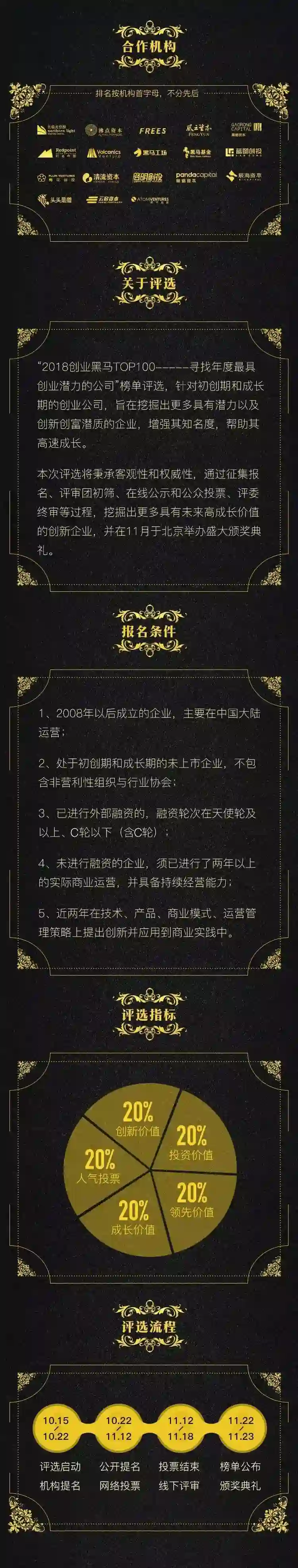 此次活动,黑马100联合了高榕资本、红点资本、启明创投等19个顶级投资机构共同推出,秉承客观性和权威性,通过征集报名、评审图初筛、在线公示和公众投票、评委终审等过程,旨在挖掘出更多具有未来高成长价值的创新企业。