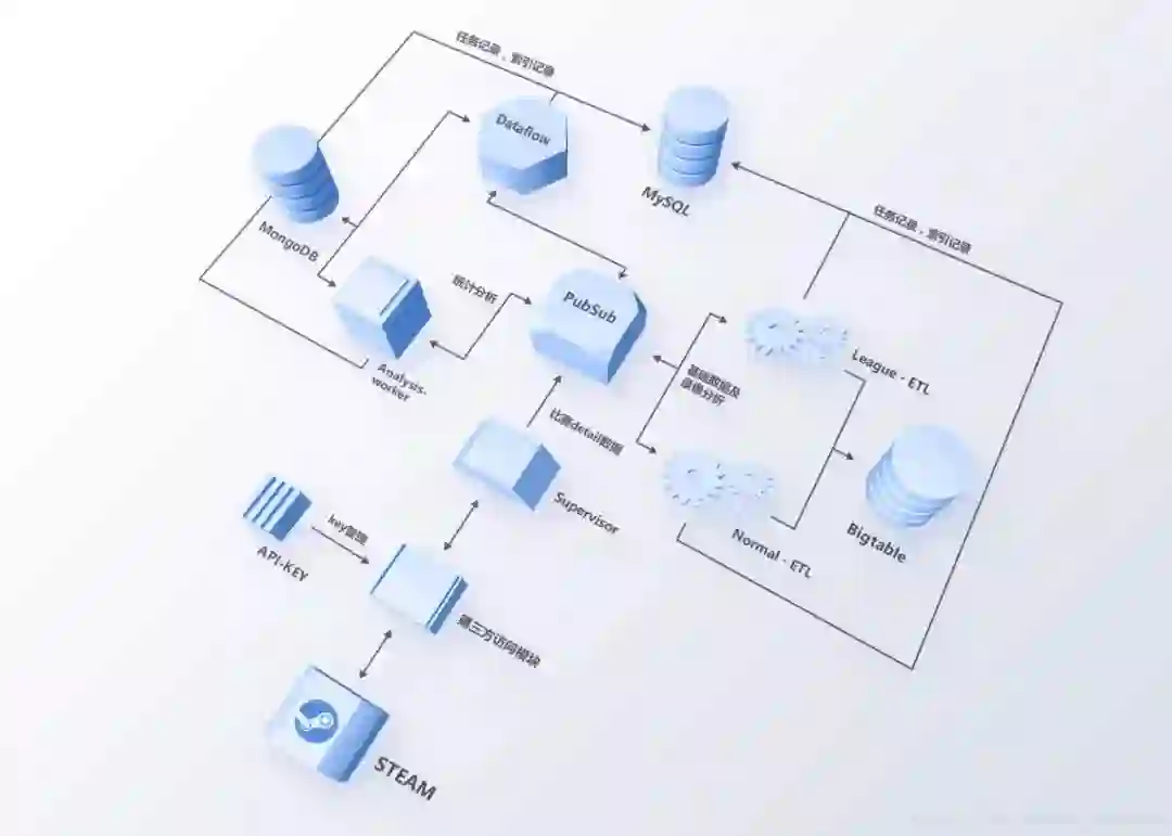 基础数据,即比赛的详情信息(KDA、伤害与补刀等数据)和录像分析数据(Roshan击杀数据、伤害类型与英雄分路热力图等数据),由Supervisor获取Steam数据触发,经过worker的清理后存入Google Bigtable;