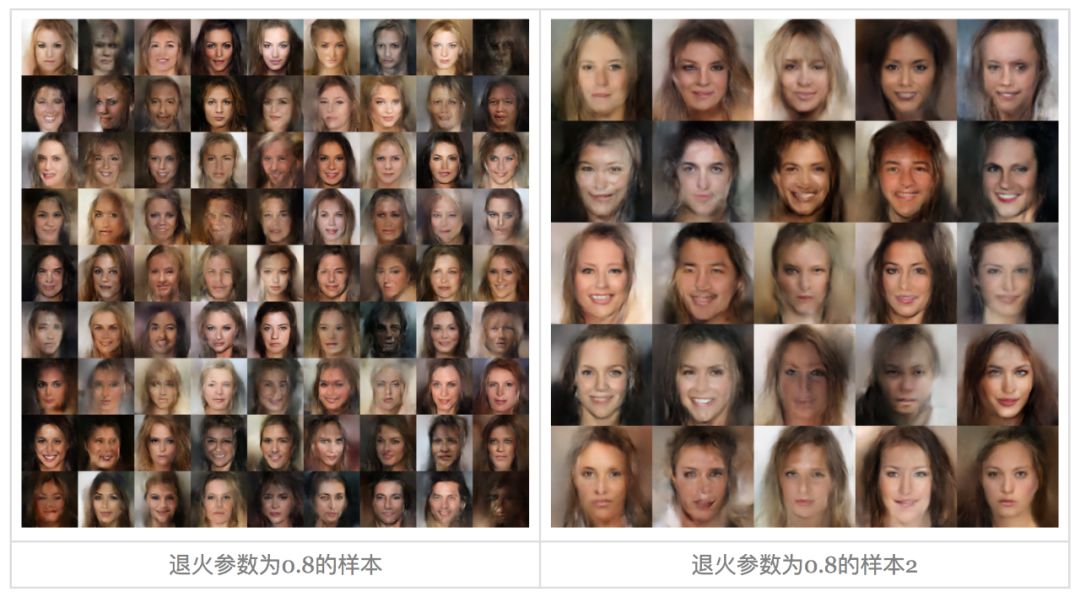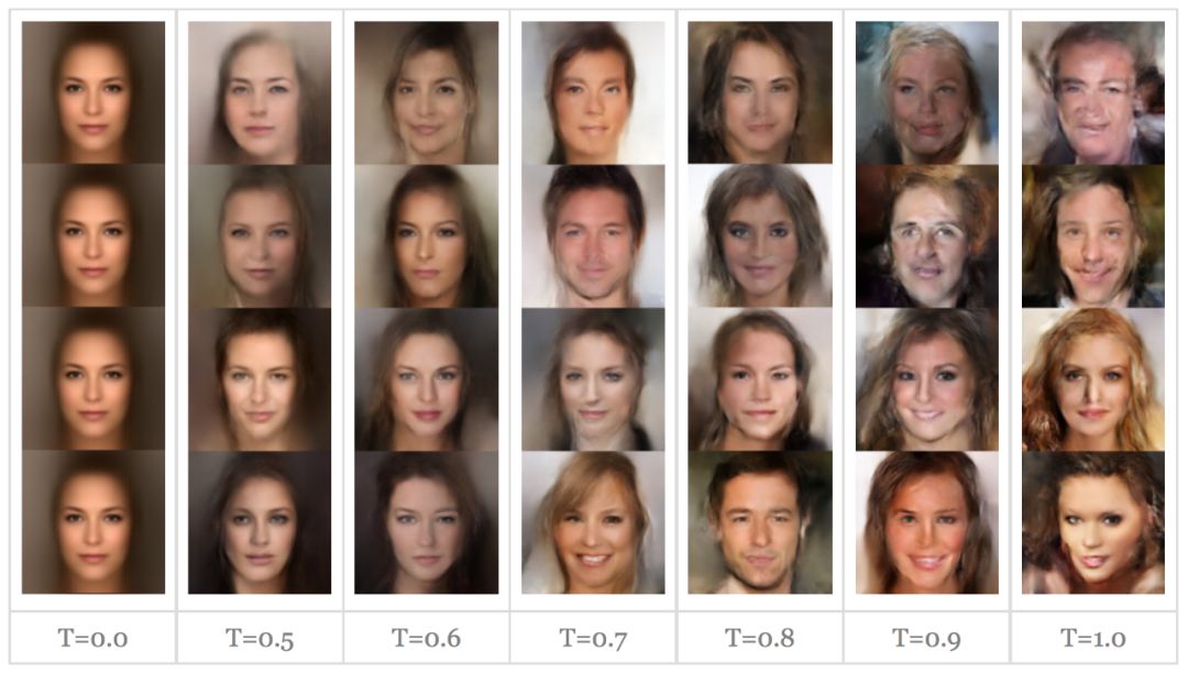 下面是 128x128 的结果(退火参数 T 指的是先验分布的方差)。128x128 的模型大概在 GTX1060 上训练了 1.5 天(约 150 个 epoch)。