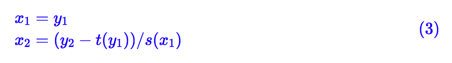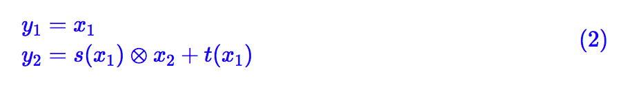 而在流模型中,q(x|z)=δ(x−G(z)),并精心设计 G(z)(通过流的组合)直接把这个积分算出来。流模型的主要组件是“耦合层”:首先将 x 分区为两部分 x1,x2,然后进行如下运算: