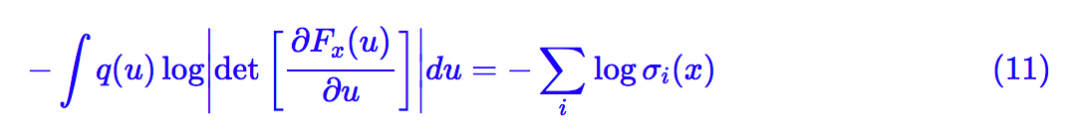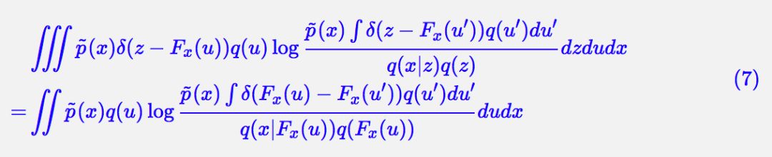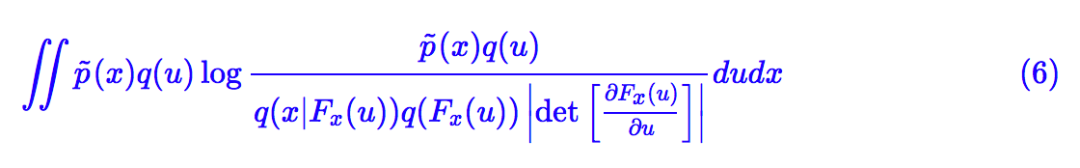 这里 q(u) 是标准高斯分布,Fx(u) 是关于 x,u 的二元函数,但关于 u 是可逆的,可以理解为 Fx(u) 是关于 u 的流模型,但它的参数可能跟 x 有关,这里我们称为“条件流”。代入 (4) 计算得到: