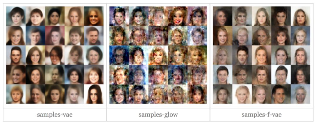 对比 VAEs 和 f-VAEs 的结果,我们可以认为 f-VAEs 已经基本解决了 VAEs 的模糊问题。对于同样规模下的 Glow 和 f-VAEs,我们发现 f-VAEs 在同样的 epoch 下表现得更好。当然,我们不怀疑 Glow 在更深的时候也表现得很好甚至更好,但很明显,在同样的复杂度和同样的训练时间下,f-VAEs 有着更好的表现。